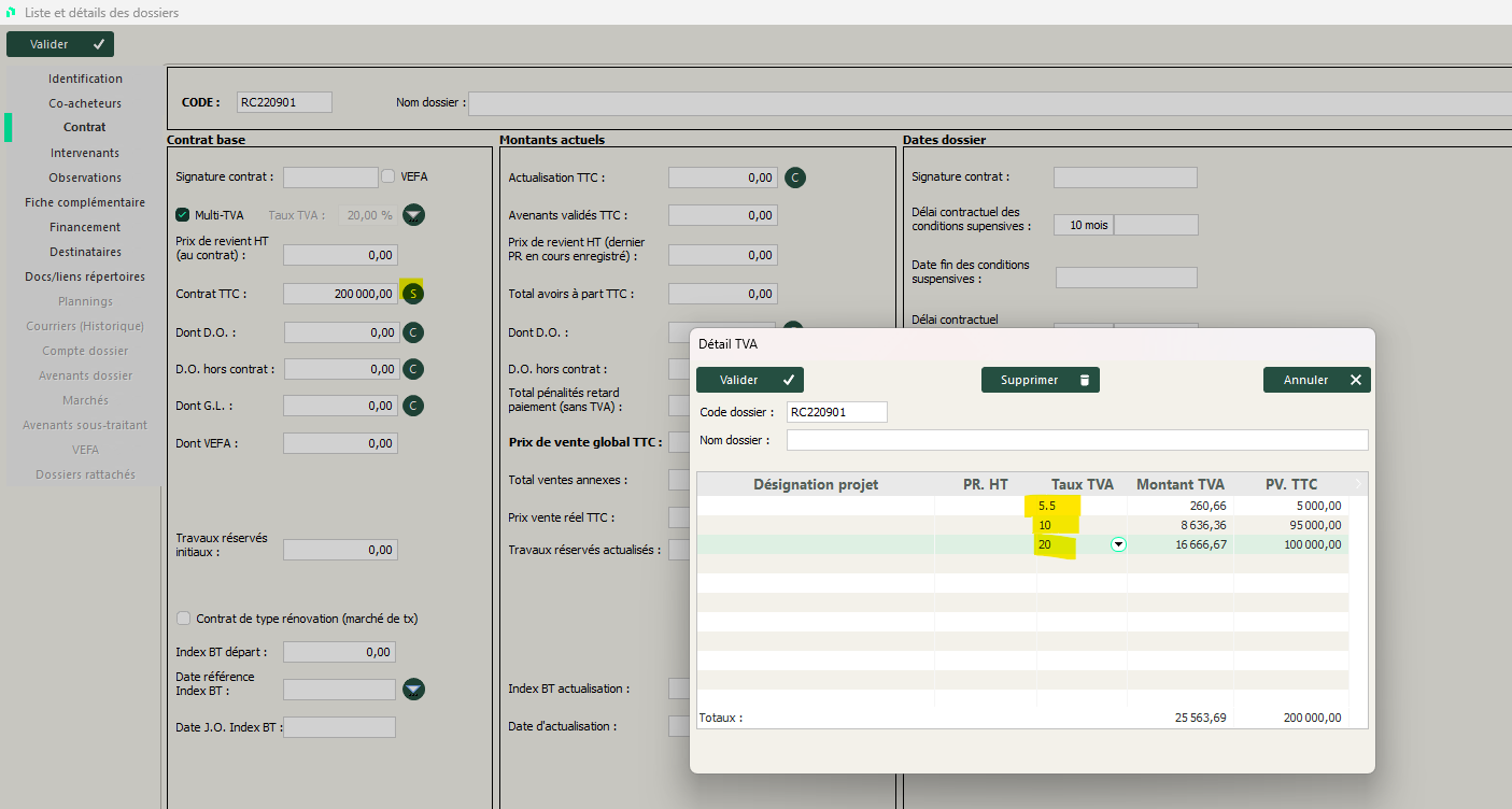 Suite à des modifications qui impliquent un autre taux (exemple taux TVA à 5,5% sur un avenant que nous ne pouvons choisir), il faut à ce moment là la rajouter dans la répartition du PV du dossier.