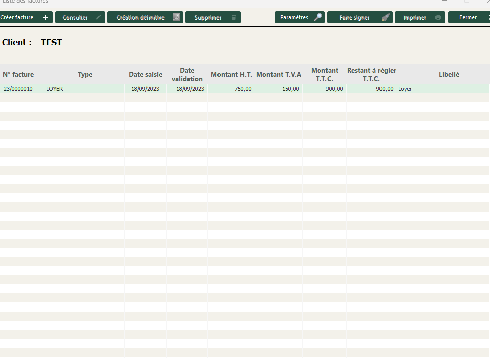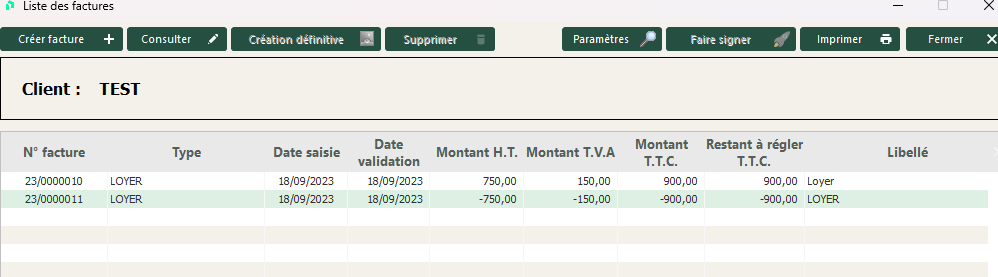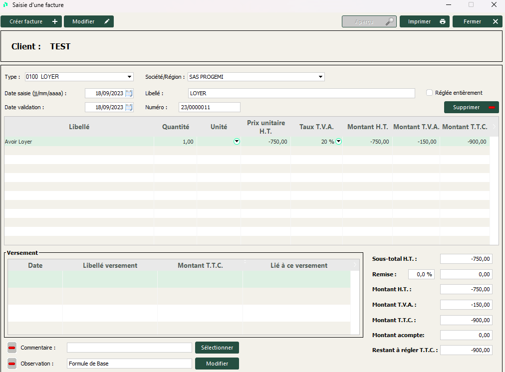 Exemple, faire un avoir sur le loyer à 900 € TTC