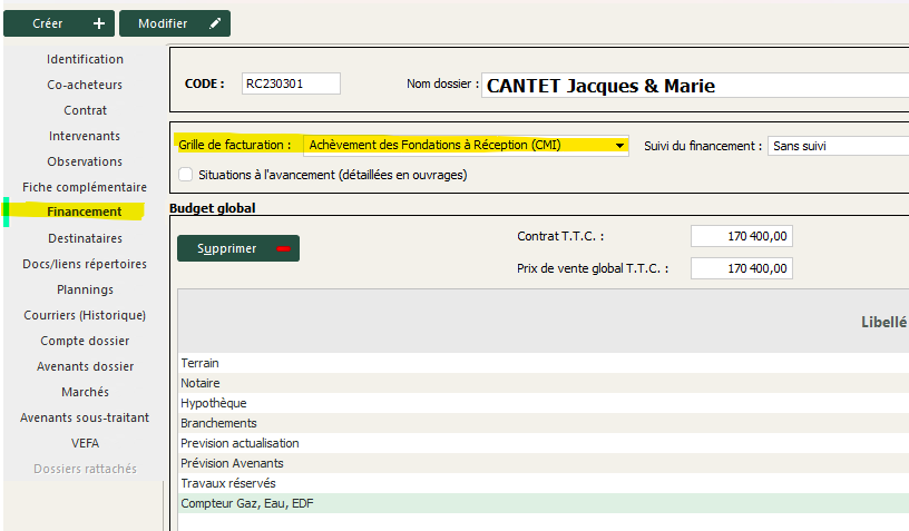 Aller dans l'onglet financement, et dérouler la liste des grilles disponibles pour choisir celle qui convient au client.